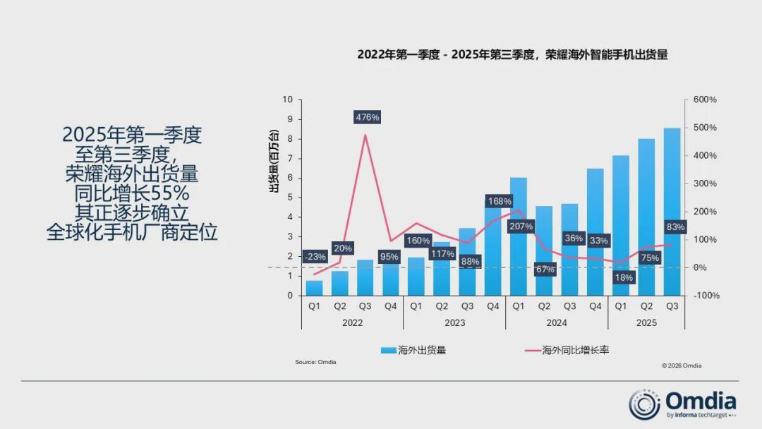 荣耀 EMT 管理团队发布的 2026 年新年致辞中,特意强调荣耀海外销量增长 47%,占比首次超过 50%。按照全球 7100 万台的发货量计算,荣耀海外销量至少为 3550 万台。